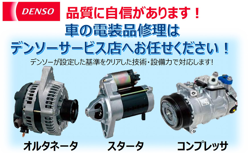 デンソーサービス店の修理は消耗部品の交換に純正パーツを使うことで高品質を維持しております。また、リビルト品のため資源を有効活用できるので環境にも配慮しております。